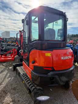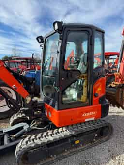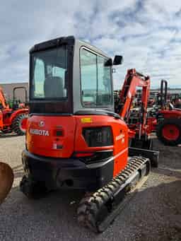 Compact Excavator w/ Cab (Heat & A/C), 4-way angle blade, mechanical quick coupler, quick attach bucket, and hydraulic thumb.